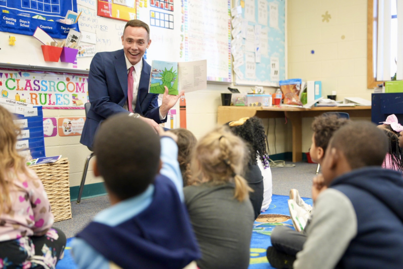 Madison, Fla., January 27, 2026 – In recognition of America’s upcoming 250th anniversary, the 18th annual Celebrate Literacy Week, Florida! focused on America’s founding with the theme “Read, White and Blue: Celebrating 250 Chapters of America.” Florida Commissioner of Education Anastasios Kamoutsas, Florida Department of Education staff and local education leaders, including the Madison County Superintendent, visited kindergarten classrooms at Madison County Central School on January 27. During the visit, Commissioner Kamoutsas and other guest readers read aloud F Is for Flag by Wendy Cheyette Lewison to 200 kindergarten and Voluntary Prekindergarten students and engaged with teachers and school leaders to promote literacy and foster strong reading habits among young learners.
